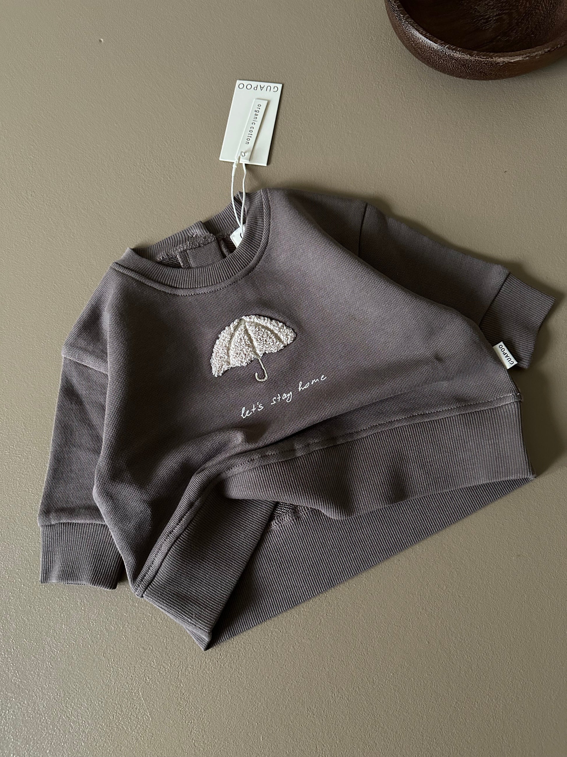 Dieser witzige und stylische braune Sweater mit der kuscheligen Regenschirm-Stickerei und dem Schriftzug „lets stay home“ ist ein echter Hingucker in der kalten Jahreszeit. Kinder lieben das weiche Material aus Bio-Baumwolle, das angenehm auf der Haut liegt und für gemütliche Stunden sorgt. Perfekt, um spielerisch warm und modisch durch den Tag zu kommen!
